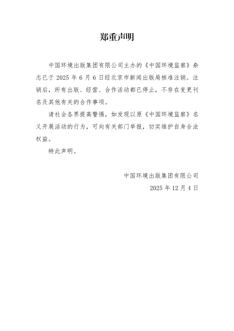 中國環(huán)境出版集團有限公司主辦的《中國環(huán)境監(jiān)察》雜志已于2025年6月6日經(jīng)北京市新聞出版局核準注銷。